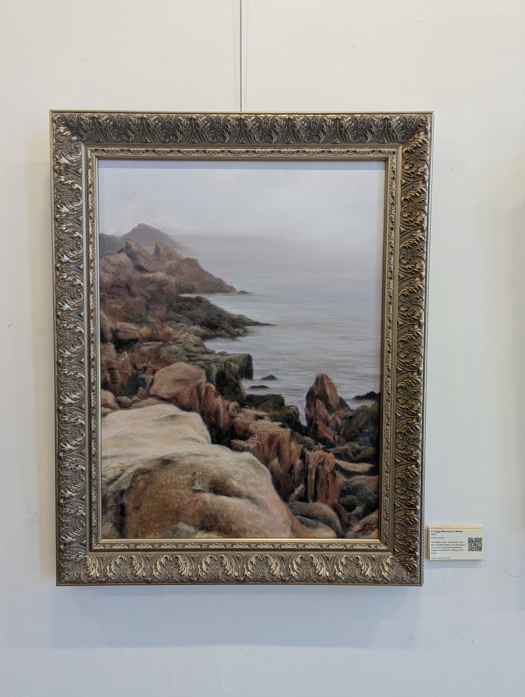 The Maine coast, softened by mist. With a limited palette and abstracted rock forms, this painting balances realism and restraint, evoking calm power.