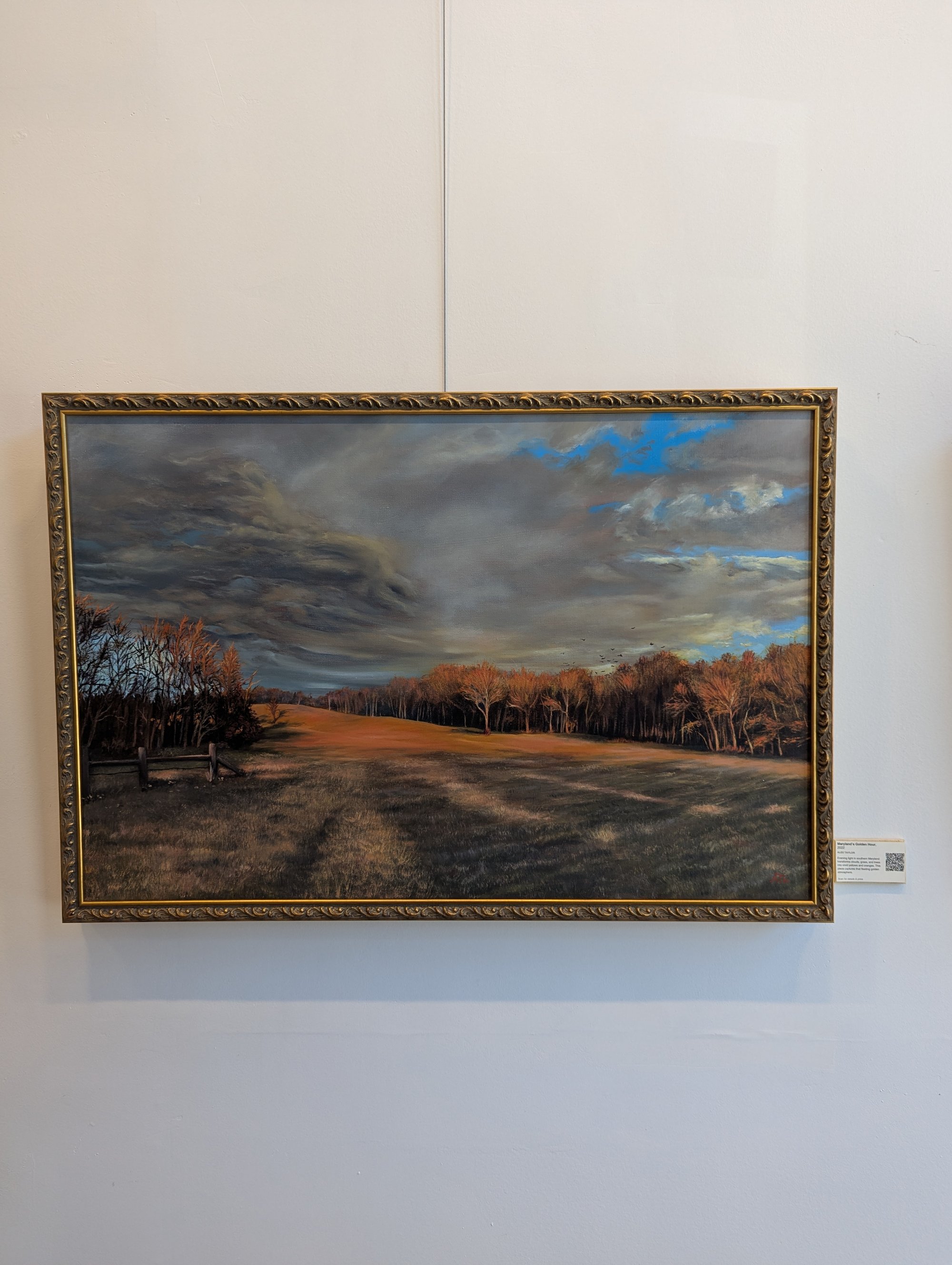 Evening light in southern Maryland transforms clouds, grass, and trees into vivid yellows and oranges. This piece captures that fleeting golden atmosphere.