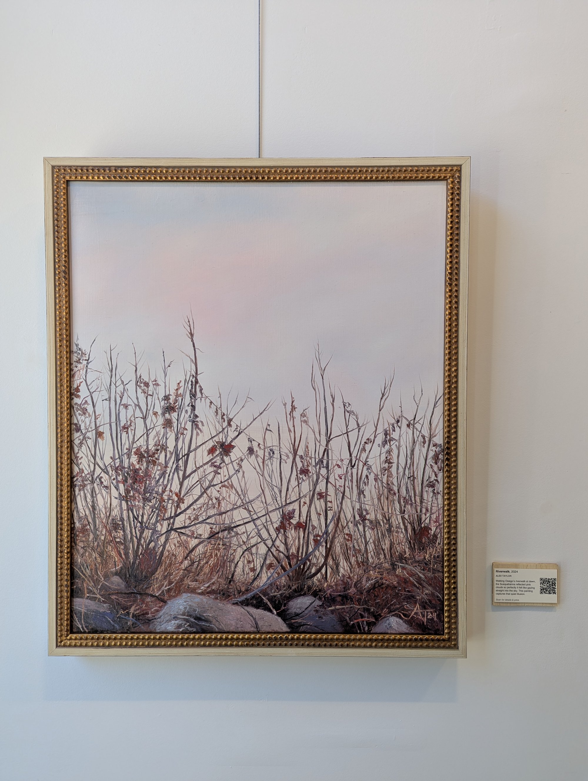 Walking Owego’s riverwalk at dawn, the Susquehanna reflected pink clouds so perfectly it felt like gazing straight into the sky. This painting captures that quiet illusion.