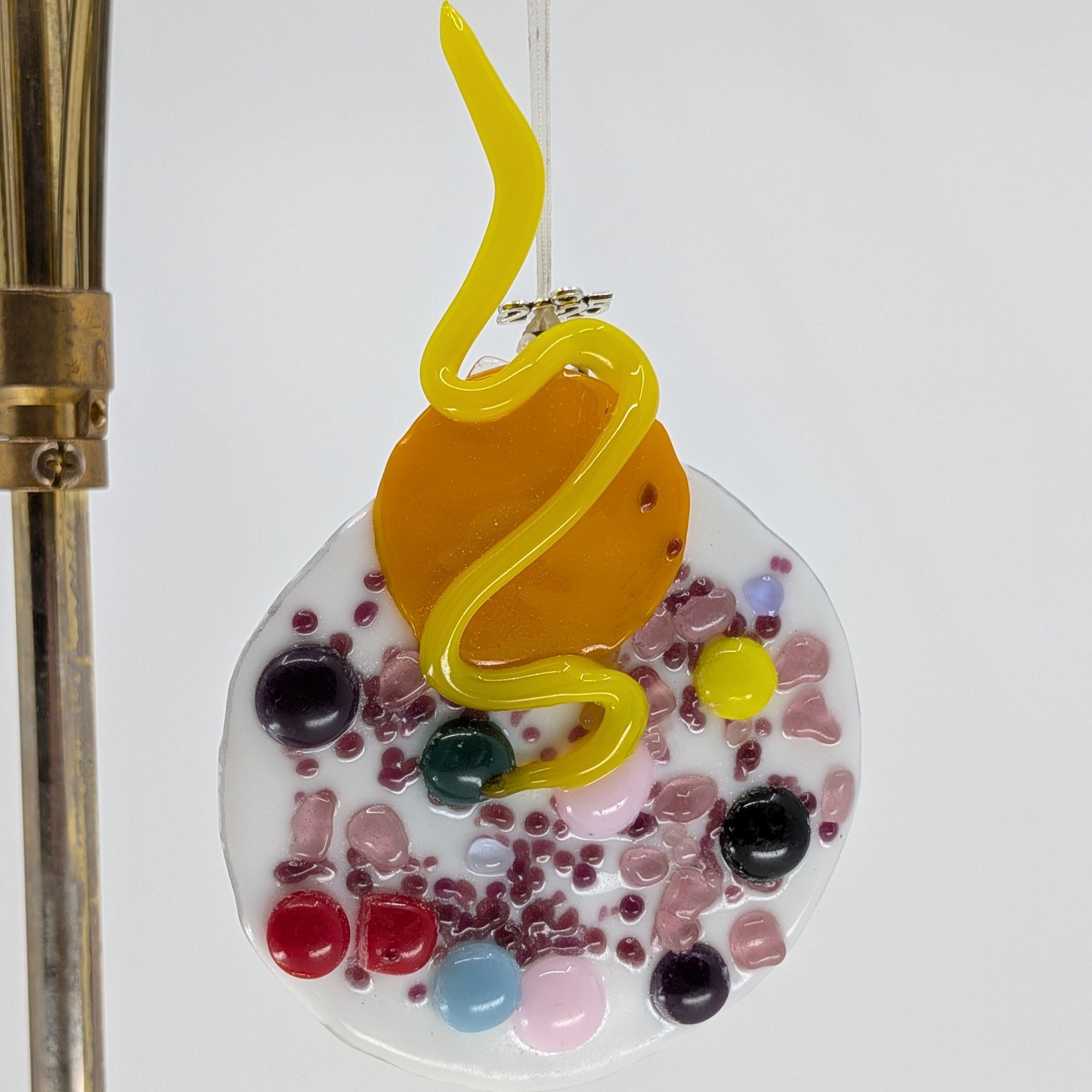 These one-of-a-kind fused glass ornaments were created by Jimmy Dutcher through Jablon Studios and handmade at Jablon Studios in Vestal, NY, a community-centered glass and mosaic program founded by artist and educator Emily Jablon.