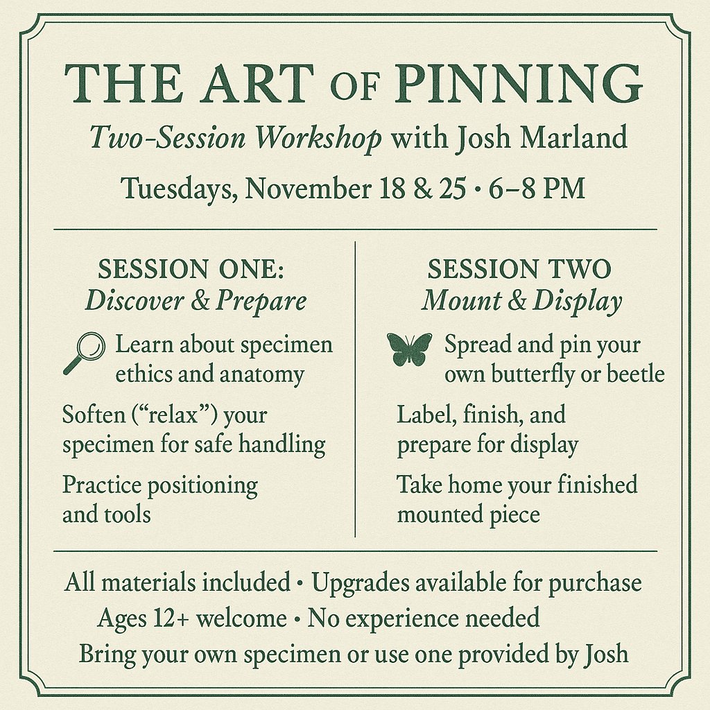 Discover the delicate art of butterfly and insect pinning in this two-part, hands-on workshop led by naturalist and local Owego creative, Josh Marland.
