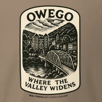 Carry a piece of Owego’s history and charm with this artisan designed Tee. It features a linographic illustration of the Tioga County Courthouse and bridge, framed by the words “Where the Valley Widens.”